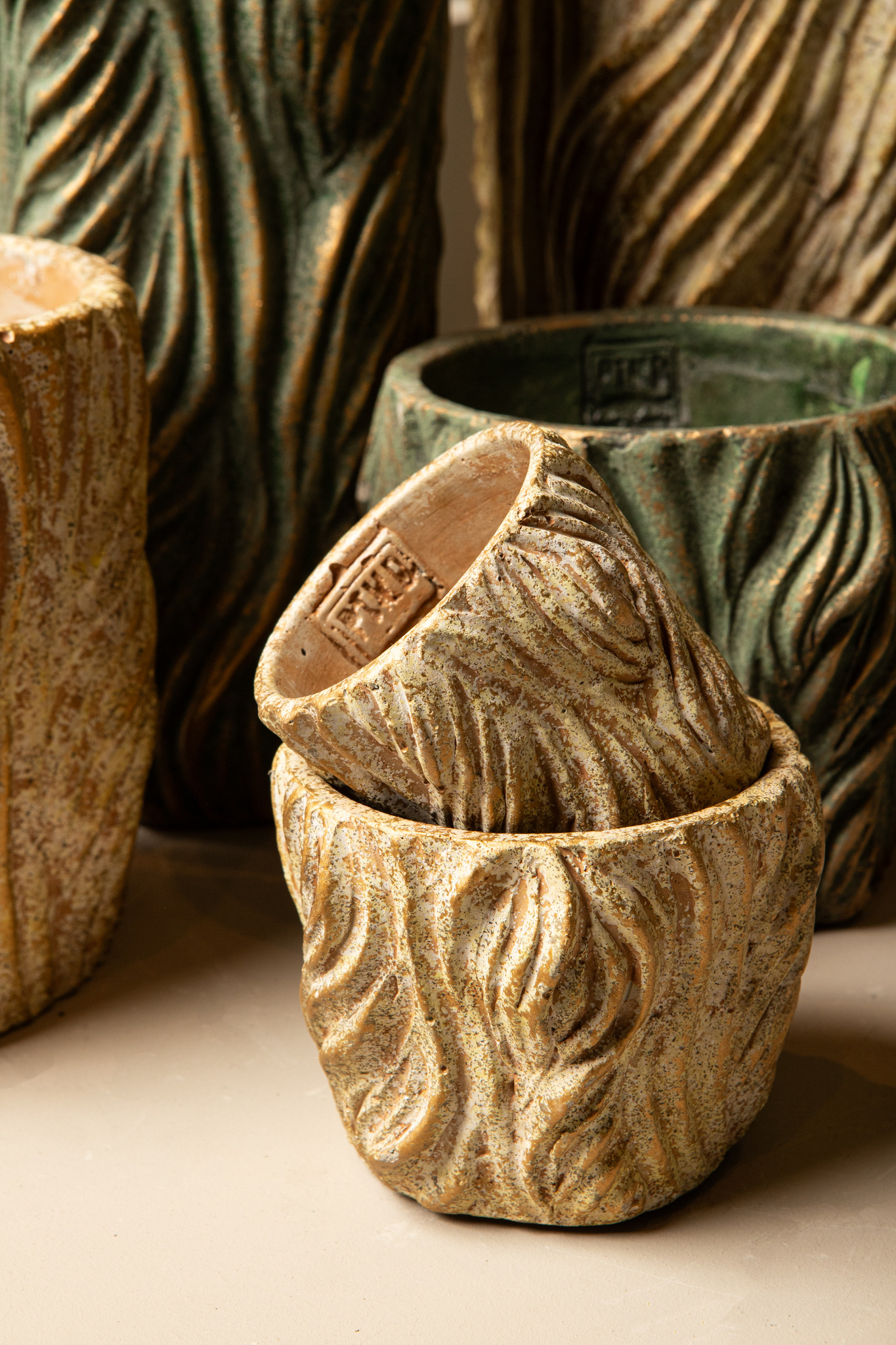 Alexio Cream round cement pot wavy lines low XL