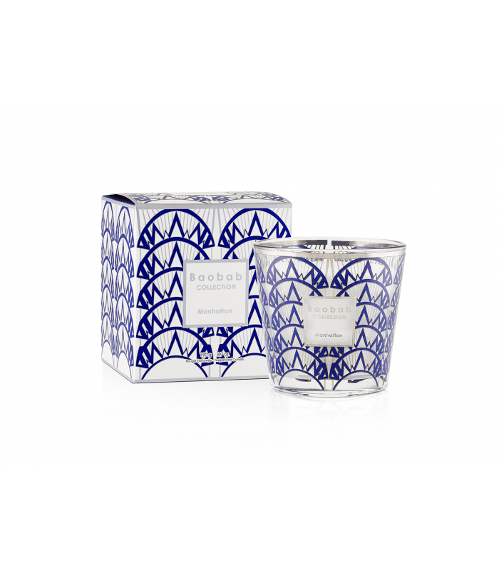 De geurkaars Manhattan is een gezeefdrukt glas van platina en marineblauw, geïnspireerd op de art deco-architectuur van het Chrysler-gebouw.