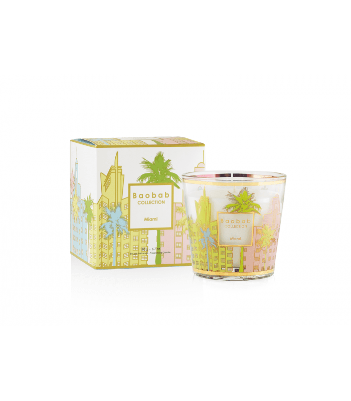De geurkaars Miami is versierd met een zeefdruk in pasteltinten en goudtinten die de architectuur van de art deco-gebouwen van South Beach weerspiegelen.