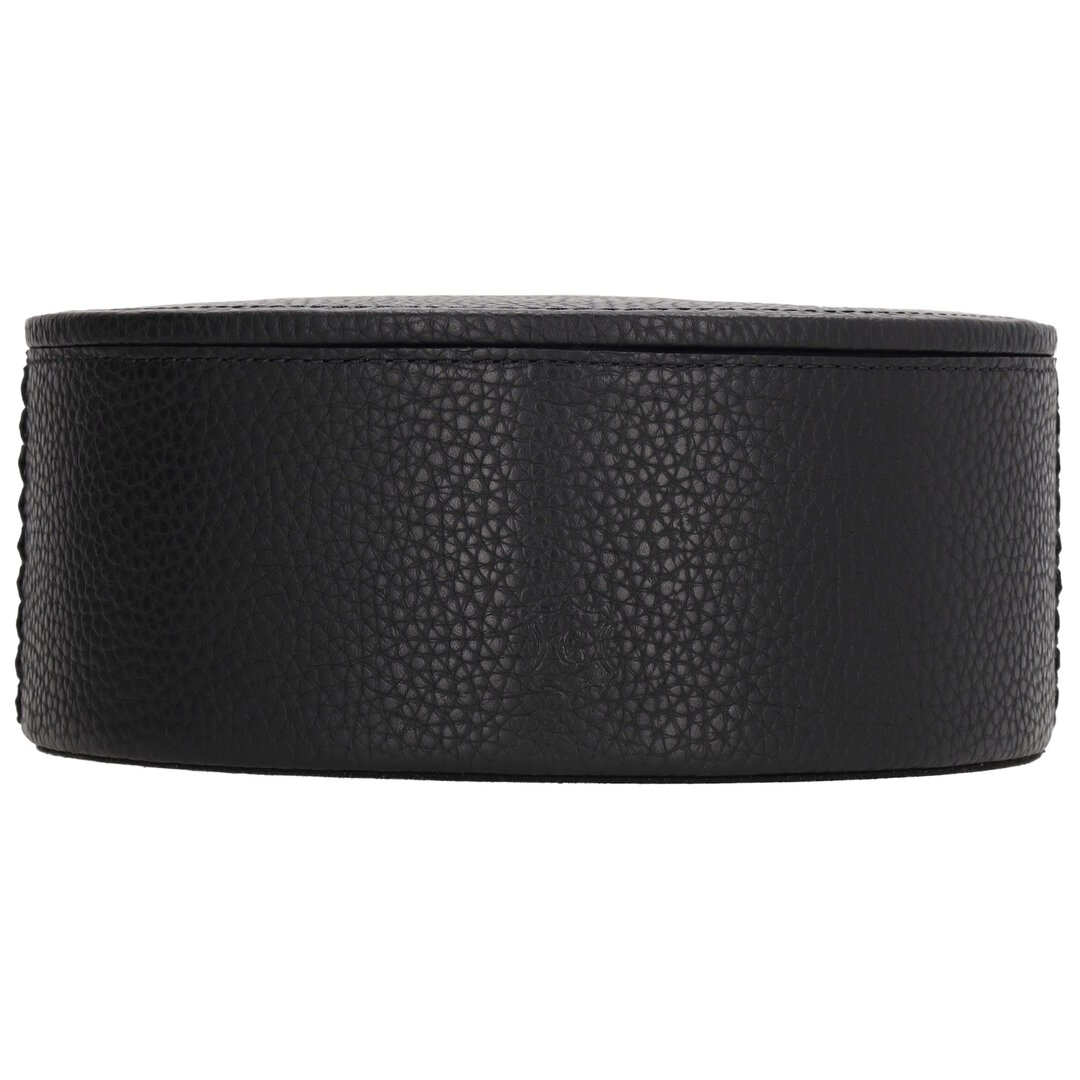 Ronde opbergdoos zwart in effen leer. Maat: ø16,5×7 cm.