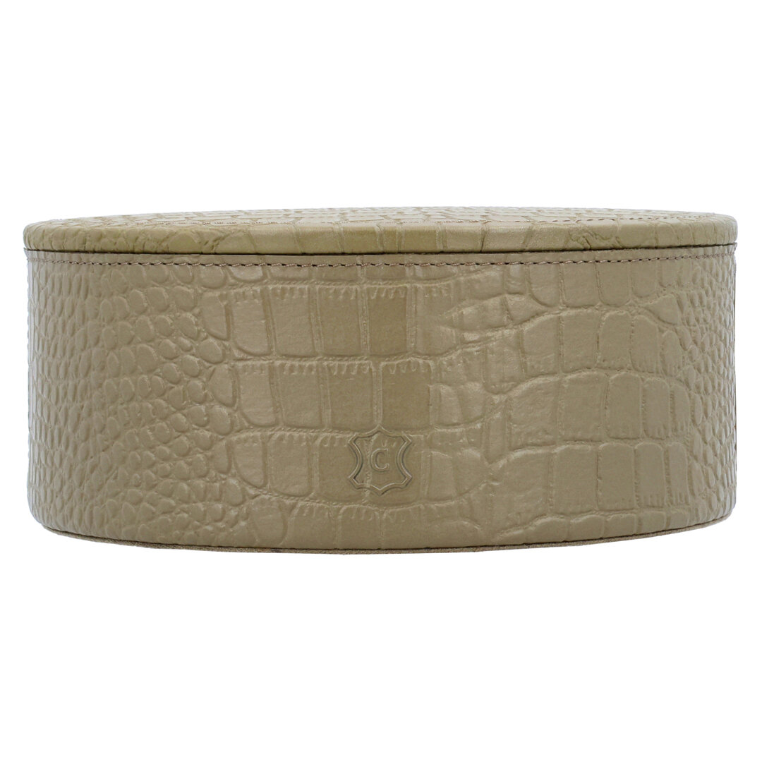 Ronde opbergdoos taupe in croco leer. Maat: ø16,5×7 cm.