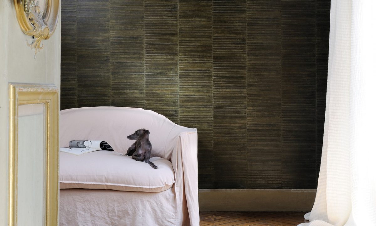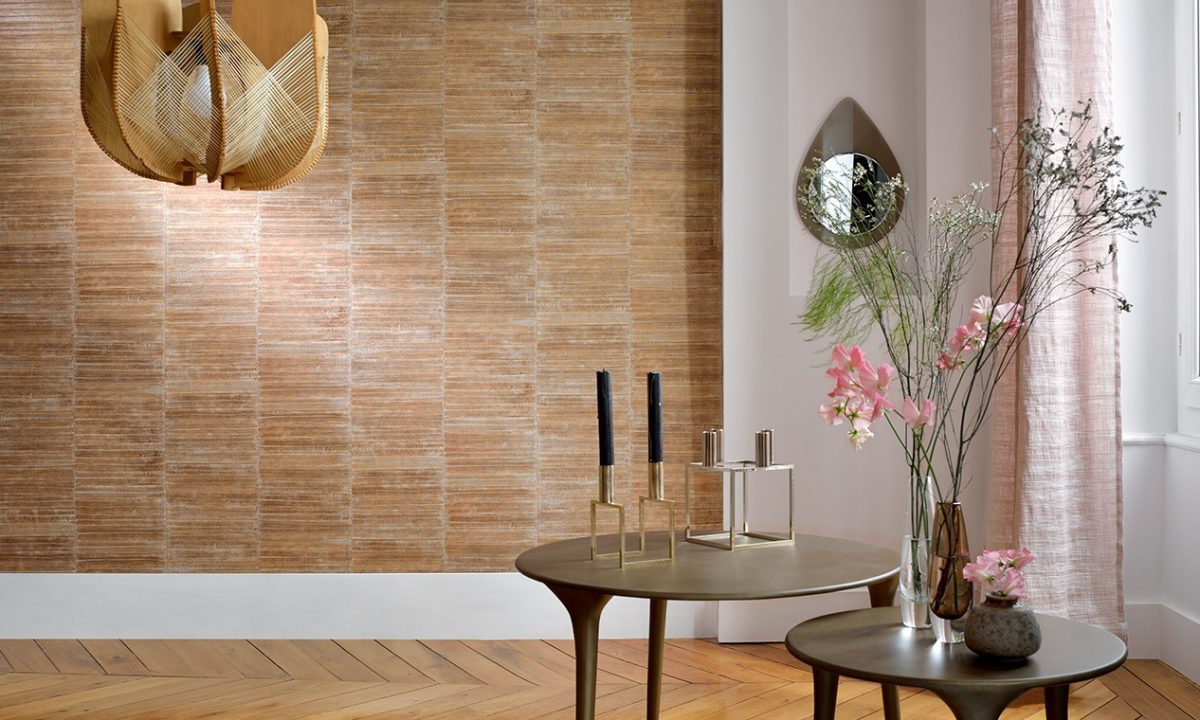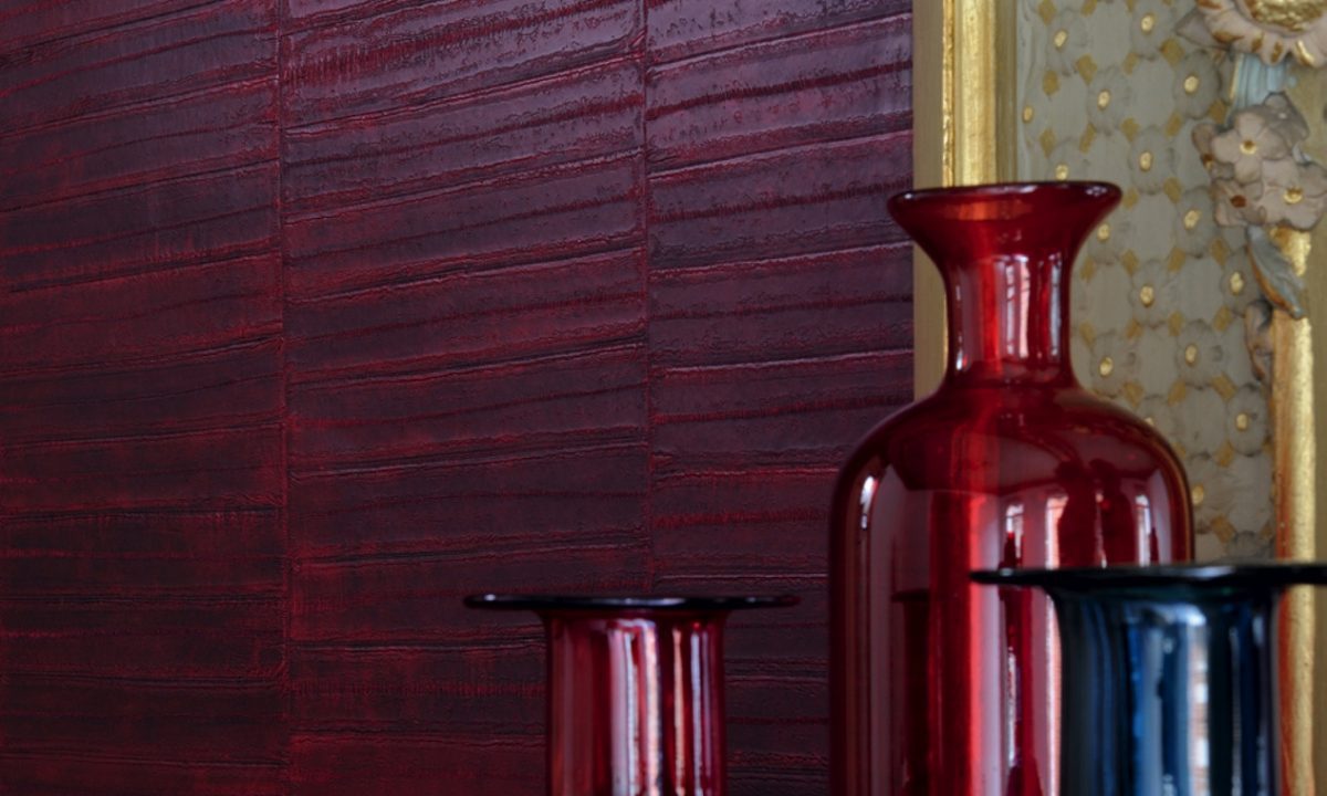 Het luxe behang van Elitis is verkrijgbaar in veel verschillende designs waaronder de Anguille & Anguille Legend. Dit behang heeft een patroon van aan elkaar gestikte palinghuiden.