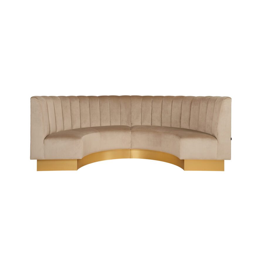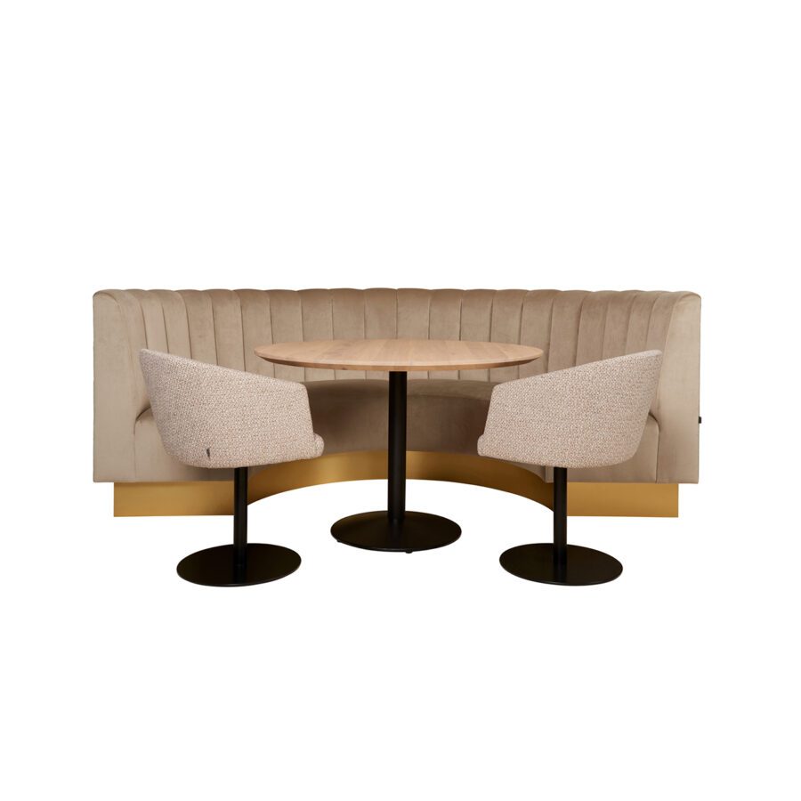 Luxe eetkamerbank met een ronde vorm. Ideaal voor in de eetkamer of in een horeca inrichting. Verkrijgbaar in elke gewenste stof.