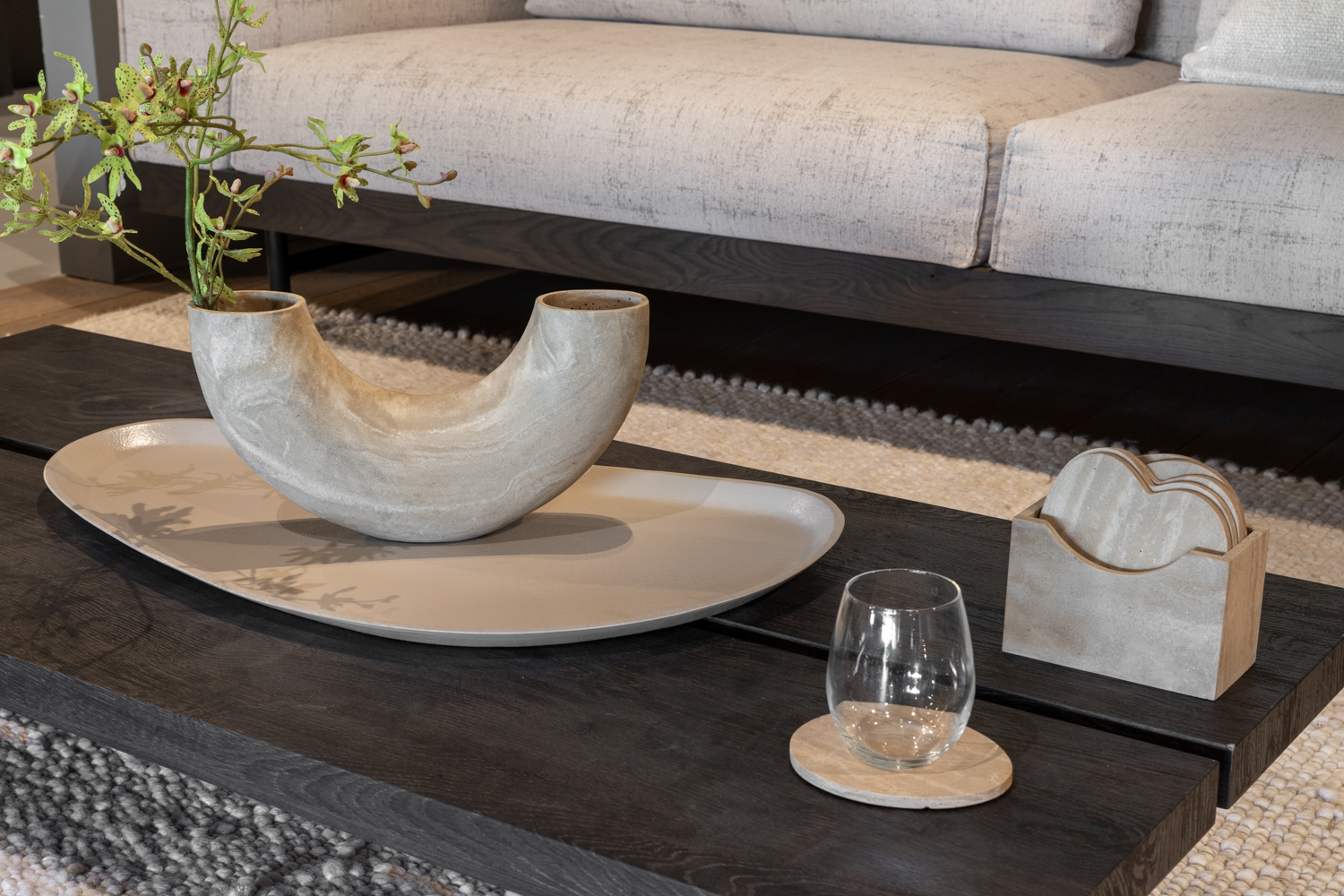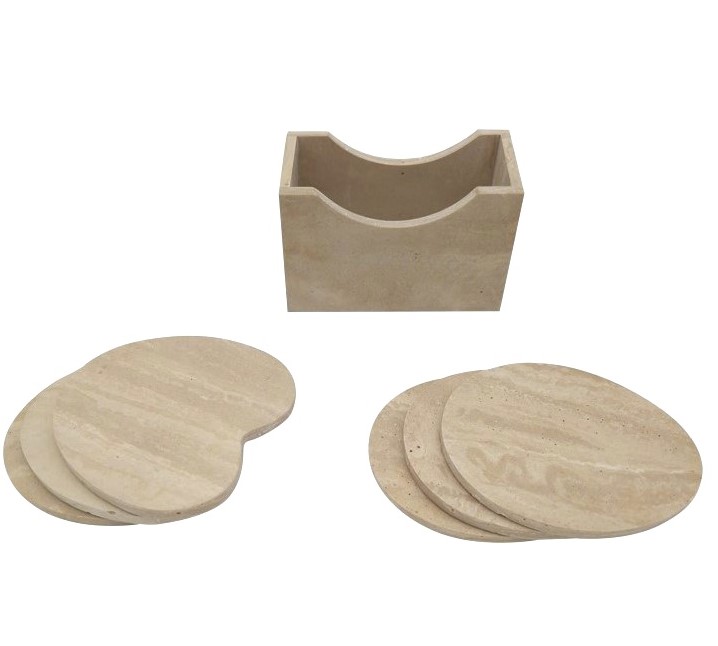 Handgemaakte onderzetters van hars in een travertine kleurtint.