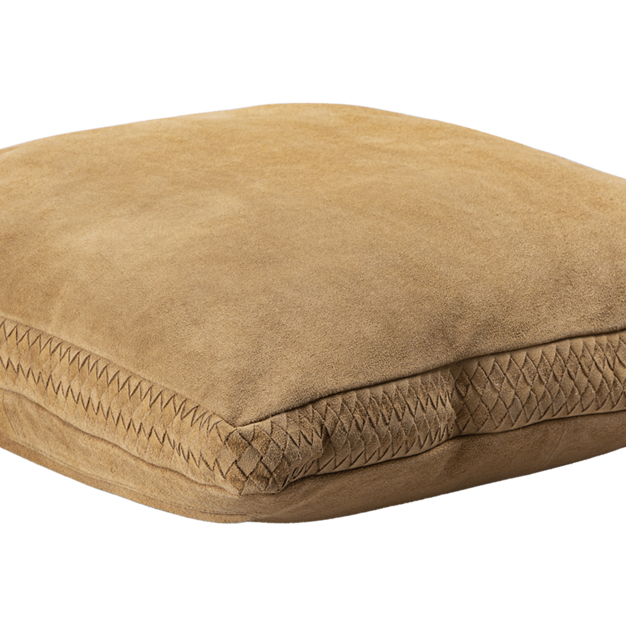 This cushion is made of 100% suede leather with a filling of 100% polyester. This is not machine washable. Only professional dry cleaning is advised.